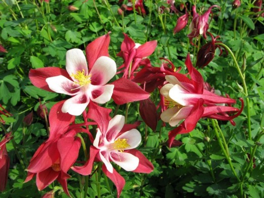 Цветки выразительные, бело-красные, с яркими красными шпорцами, до 8 см в диаметре, на длинных цветоносах. Цветут с июня по июль.