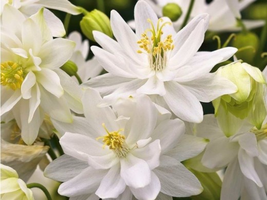 Обильно цветущая аквилегия с крупными, не поникающими цветками. Цветы махровые, абсолютно белые, диаметром до 6 см. В первый год образует от 3 до 5 прямостоячий, слегка опушенный стеблей, во второй год их число возрастает до 5-10. Цветет в июне-июле.