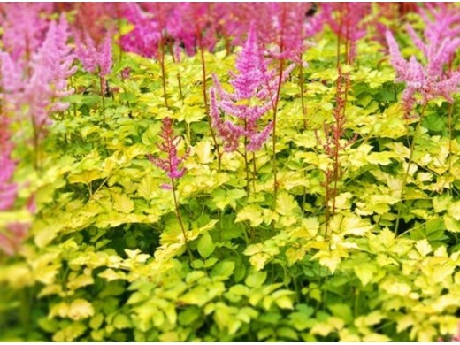 Астильба Арендса "Color Flash Lime" - новый сорт с лимонными листьями и ярко-розовыми цветками. В течение всего сезона окраска листьев будет меняться от светло-зеленого до красноватого.