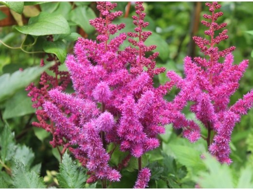Плотные гроздья крошечных фиолетово-лиловых цветков сбиваются в метелки, образуя пушистые перья. Для китайской астильбы характерны очень плотные соцветия, длина которых составляет 15-20 см. Форма соцветия пирамидальная.