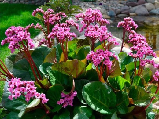 Бадан сердцелистный – многолетнее травянистое растение, которое состоит из больших глянцевых листьев и розовых цветов на высоких малиновых ножках.
