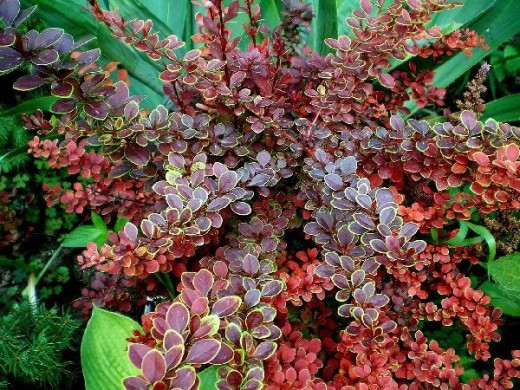 Барбарис Тунберга "Golden Ring" - отличительная особенность этого декоративного кустарника - пурпурные листья с желтой каймой. Сорт хорош в качестве живой изгороди, в рабатках, вдоль дорожки для имитации аллеи и как солитер.