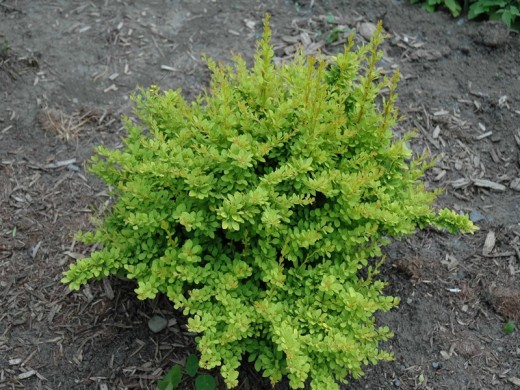 Куст достигает высоты 1 м и диаметра около 0,8 м. Листья мелкие, овальные, ярко-желтые, который сохраняется на протяжении всего сезона, осенью приобретая ещё более насыщенные тона.