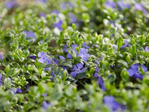 Барвинок малый "Ralph Shugert" - вечнозеленое, почвопокровное растение. Применяется для оформления склонов, подпорных стенок и приствольных кругов деревьев.