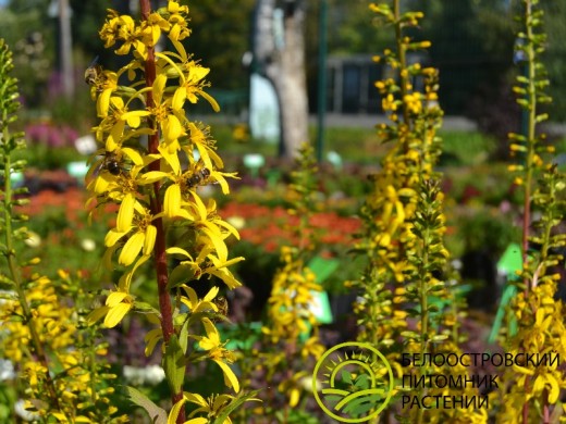 Цветение обильное, начинается в июле. Соцветия ярко-желтые колосовидные на тёмных цветоносах высотой до 120 см.