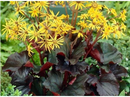 Красивое растение для полутенистых влажных мест. Очень компактное, высотой 30 см и шириной 40 см. Листья глянцевые, тёмно-фиолетовые, округлые, грубо зубчатые, на длинных черешках. Цветки жёлто-оранжевые ромашковидные. Цветение в июле. Место полутенистое или солнечное. Почва влажная, плодородная. Зона 4 (до -29ºС).
