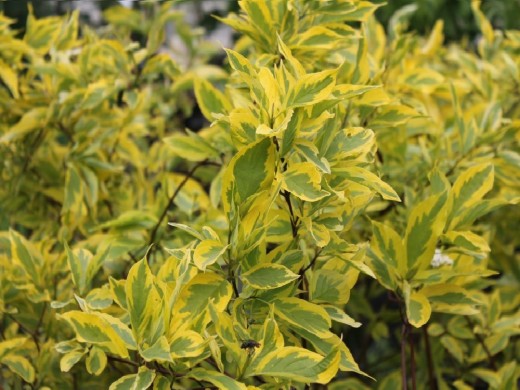 Дерен белый "Gouchaultii" декоративный пестролистный кустарник с пышной раскидистой кроной. Отлично смотрится в одиночных и групповых посадках, живых изгородях. Растение высотой до 2 м и диаметром до 2,5 м с раскидистой кроной. Листья зелено-желтые с золотистой каймой, побеги красного цвета. Ежегодный прирост в высоту и ширину 40-60 см. Цветет в июне, в течение 15-20 дней. Соцветия белые, с приятным медовым ароматом. Теневынослив, но в тени окраска листьев зеленеет. Предпочитает достаточно увлажненные супесчаные почвы, с нейтральной кислотностью. Рекомендуется регулярная стрижка. Хорошо переносит наши зимы и городские условия, в целом неприхотлив в уходе. (АБ)