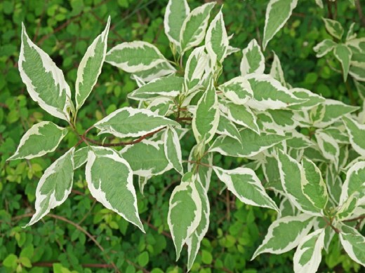 Дерен белый "Elegantissima" - самый популярный сорт. Декоративный раскидистый кустарник с белоокаймленными листьями и кораллово-красными побегами, хорошо смотрится в одиночных и групповых посадках, живых изгородях и топиарных формах. Взрослое растение достигает 3 м в высоту и ширину. Ежегодный прирост в высоту 40-50 см. Побеги прямые, крепкие, красных оттенков. Цветет в июне, в течение 15-20 дней, зонтичными соцветиями молочных оттенков. Теневынослив, но в тени окраска листьев зеленеет. Не требователен к составу почвы, может расти даже на самых бедных. Рекомендуется регулярная стрижка. Хорошо переносит наши зимы и городские условия, в целом неприхотлив в уходе. (АБ)