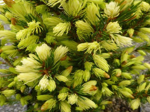 Окрас молодой хвои кремово-желтый.