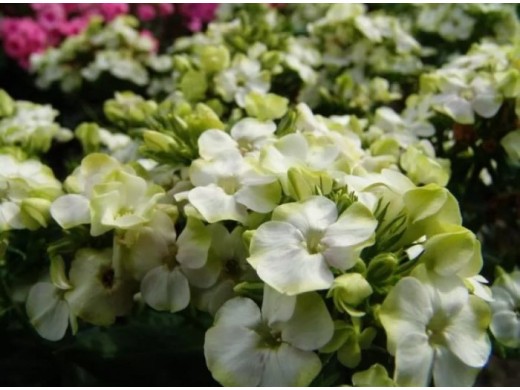 Высота растения всего 40 см , и ширина 40см. Небольшие белые, с зелеными вставками цветки диаметром 1,5-2см собраны в крупные соцветия. Цветки сидят так плотно, что теснят друг на друга, как в плотно связанном букете. Цветение с июля по август. Аромат средний, цветочный, ненавязчивый.