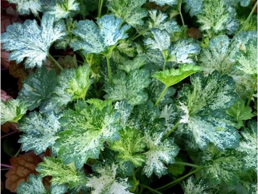 Гейхера Dew Drops – корневищное многолетнее травянистое растение до 30 см высотой, диаметром до 40 см. Листья собраны в прикорневую розетку, образуют компактный, округлый кустик. Растения развивают многочисленные цветоносы, отрастающие и цветущие разновременно. Разрастается быстро, декоративные свойства сохраняет в течение всего сезона. Листья у гейхеры Дью Дропс – большие, округлые, зубчатые, слегка гофрированные. Зеленого цвета с разновеликими светлыми мраморными брызгами и розоватыми прожилками. Цветы мелкие, ярко–красные собранные в рыхлую кисть на высоких, до 40 см, цветоносах. Цветение приходится на июнь–август.