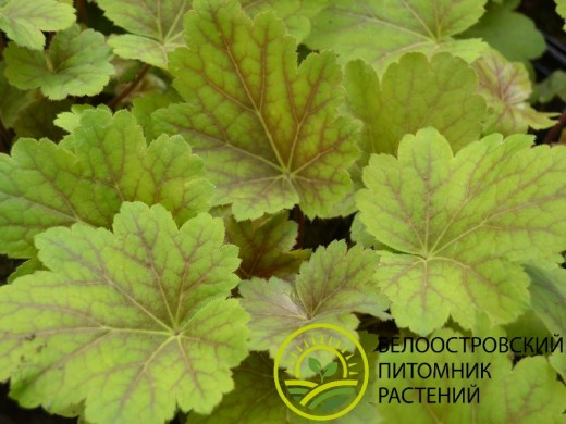 Листья крупные, лопастные, с волнистыми краями, в начале сезона ярко-жёлтые с выразительными красными жилками, затем переходят в мягкий шартрез (желтовато-зелёный) летом и приобретают бронзовый оттенок зимой. С июня по июль над листвой возвышаются тонкие цветоносы с мелкими белыми цветками диаметром около 0.5 см, собранными в рыхлые соцветия, которые добавляют растению лёгкости.