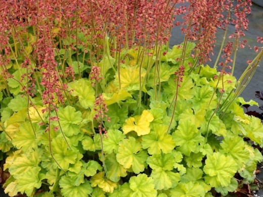 Высота растения достигает 25см и ширина 40см. Листья округлые, ярко-зелёного, лаймового цвета. Цветки розово-красные, небольшие, собраны в метельчатые соцветия на цветоносах высотой до 50 см. Цветение в конце мая, в начале июня.
