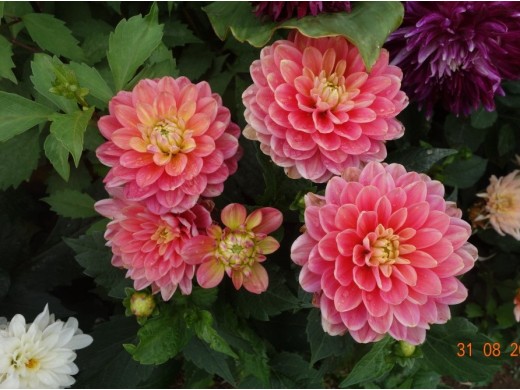 Одна из самых популярных среди низкорослых сортов. Имеет красивый цветок, состоящий из двух цветов — нежно-розового по краям и желто-кремового посередине. По мере цветения оттенок может меняться. Цветы набитые, махровые. В среднем диаметр цветка данного сорта 10-13 см. Сорт обильноцветущий. Начинает цветение с июля и продолжает до ноября. Отлично подходит для выращивания в кашпо и горшках. Листва зеленого цвета с буроватым оттенком. На зиму требует обязательной выкопки.Характеристики: