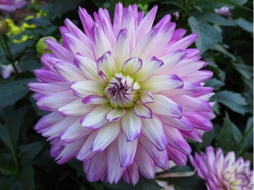 Цветок махровый, сиреневый, диаметром 15 см. Плоские язычковые цветки, слегка закрученные в трубочку, плотно прилегают к друг другу образовывая шар. Листья перистые, тёмно-зеленые, многочисленные. Куст мощный, пышный, стебли полые высотой 120 см. Предпочитает солнечные, защищенные от ветра места, плодородные хорошо дренированные почвы.
