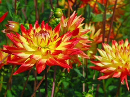 Сказочный вид этих полукактусовых георгин поразит всех солнечно-желтыми лепестками с горящими алым цветом кончиками. Эти цветы создают эффектные всплески света на ваших клумбах. Высота растения 1,0м, размер цветка 18см.Характеристики: