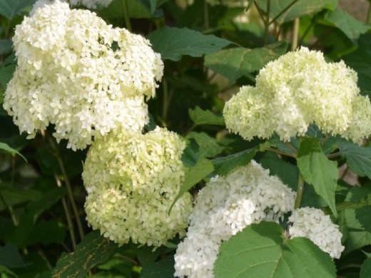 Шаровидные соцветия достигают 20 см в диаметре. Цветки молочно-белого цвета. Цветение обильное, с июля до заморозков.