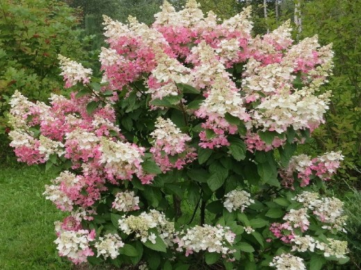 Соцветия крупные (до 30 см), конические, изящные, состоящие из крупных стерильных цветков на довольно длинных цветоножках. Начинает цвести в июле. В начале цветения соцветия белые,затем приобретают светло-розовую окраску разной степени насыщенности.