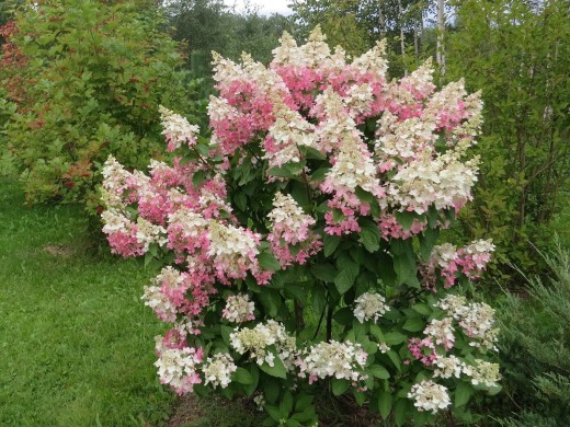 Соцветия крупные (до 30 см), конические, изящные, состоящие из крупных стерильных цветков на довольно длинных цветоножках. Начинает цвести в июле. В начале цветения соцветия белые,затем приобретают светло-розовую окраску разной степени насыщенности.
