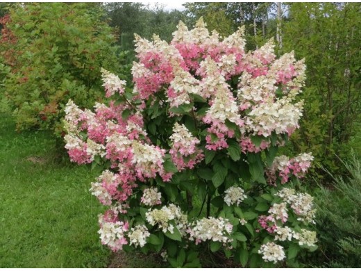 Соцветия крупные (до 30 см), конические, изящные, состоящие из крупных стерильных цветков на довольно длинных цветоножках. Начинает цвести в июле. В начале цветения соцветия белые,затем приобретают светло-розовую окраску разной степени насыщенности.