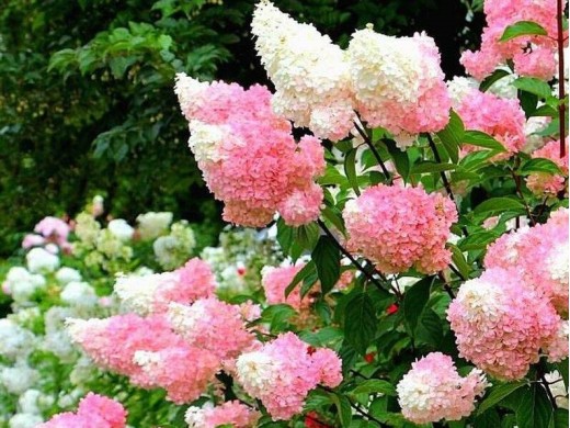 Гортензия метельчатая "Strawberry Blossom" кустарник с пышно цветущими соцветиями и компактной кроной, хорошо будет смотреться в контейнерных посадках, а также в качестве бордюра или солитера.