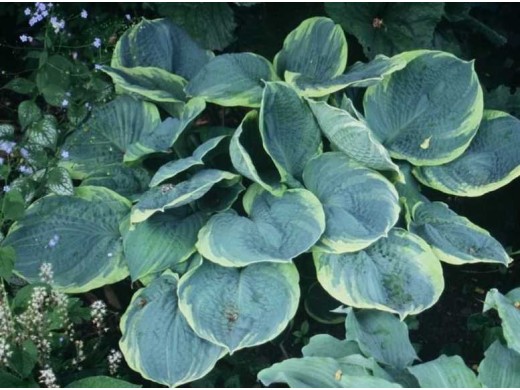 Листовые пластины очень декоративные: сизо-зеленые с кремово-желтоватой каймой. Форма - узко сердцевидная, кончик заостренный. Поверхность матовая, с заметными прожилками. Листья плотные. Цветение хосты начинается в июне и длится около 1 - 1,5 месяцев. Цветки небольшие (длина - до 5 сантиметров), по форме напоминают колокольчики и образуют небольшие соцветия. Цвет – светло лавандовый. Максимальная высота взрослого растения 45см , а диаметр – 80см .