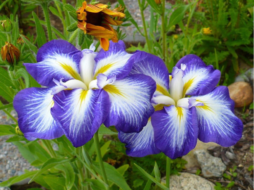 Ирис известен также как мечевидный ирис — благодаря форме светло-зеленых листьев. Ароматные цветы тёмно-голубого окраса имеют белые широкие прожилки и желтые штрихи в центре соцветия. Распустившийся цветок может достигать 15 см в диаметре, а высота куста — до 110 см.