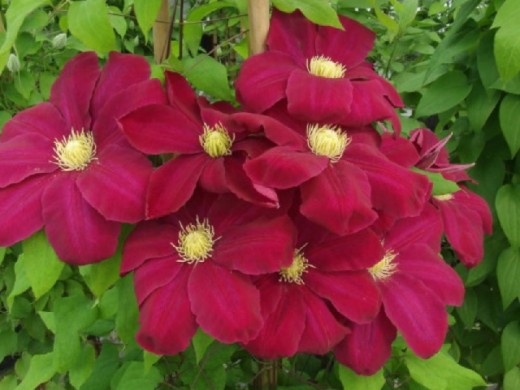 Крупноцветковый сорт японской селекции. Клематис с крупными карминно-красными цветами простой формы 15-18 в диаметре и желтыми пыльниками. Лепестки имеют бархатистую поверхность. Цветение обильно с середины июня и до сентября. Высота растения достигает 2м. Предпочитает солнечные места, но корни и основание побегов должны быть затенены. Лучше всего растёт в плодородной суглинистой или супесчаной почве. Группа обрезки 2-я: её проводят ранней весной, как только появляются новые побеги. В это время удаляют все мертвые или поврежденные стебли, побеги укорачивают до пары крепких почек на высоте примерно 80 см (Р.Н.)Характеристики: