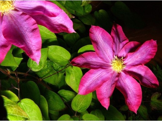 Клематис гибридный Какио предпочитает прохладные места и полутень, с умеренно влажными, плодородными почвами. Цветет обильно в мае-июне, повторно зацветает в августе и цветет до конца сентября. Цветки простые, искристые, тёмно-розового окраса со светлыми полосами по центру чашелистиков, размером 12-16см. Высота растения 2,0-2,5м. Группа обрезки 3.