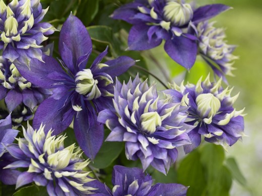 Цветки крупные, пурпурно-фиолетовые с салатовыми кончиками, диаметром 10-12 см.