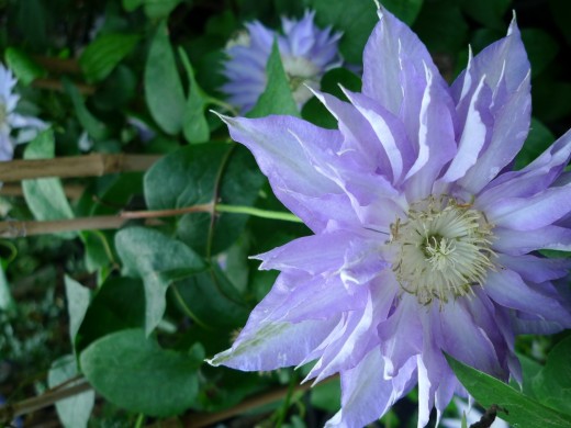 Диаметр цветка 10-12 см. Цветки махровые, нежно-голубого цвета. Тычинки белые. Лепестки слегка волнистые, с заострёнными кончиками. Обильное цветение с начала июня до сентября.