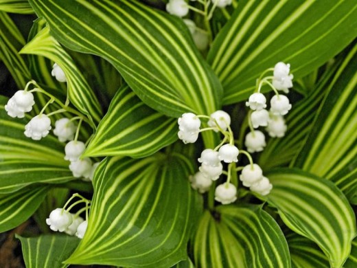 Ландыш "Albostriata" цветет в ранние сроки — с мая по июнь, радуя обильным цветением и сохраняя привлекательность листвы до осени.