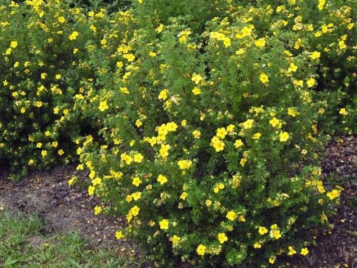 Лапчатка кустарниковая "Goldfinger" - листопадный кустарник с большими ярко-желтыми цветками, подходит для создания красивых и ярких композиций. Хорошо выглядит в качестве солитера, в цветущих живых изгородях, в групповых посадках, прекрасный компаньон для вечнозеленых растений.