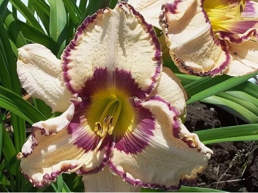Цветки большие, диаметром 18 см, цвета слоновой кости с глазком цвета бургунди и жёлто-зеленовытым горлом. Кайма цвета бургунди с золотом. Цветение в июле. Высота 70 см.