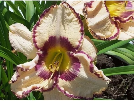Лилейники идеальны для использования в различных ландшафтных композициях. Листья узкие, создают красивый фон для эффектных цветков. Прекрасно смотрится как в одиночных посадках, так и в групповых композициях, добавляя яркий акцент в любой сад. Цветки большие, диаметром 18 см, цвета слоновой кости с глазком цвета бургунди и жёлто-зеленовытым горлом. Кайма цвета бургунди с золотом. Цветение в июле. Высота 70 см. Для достижения наилучших результатов рекомендуется высаживать лилейник на солнечных участках с плодородной, хорошо дренированной почвой. Регулярный полив в период активного роста и цветения способствует обильному формированию бутонов и продолжительному цветению. Лилейники обладают высокой морозостойкостью, что позволяет выращивать их в различных климатических условиях. (У.Д)