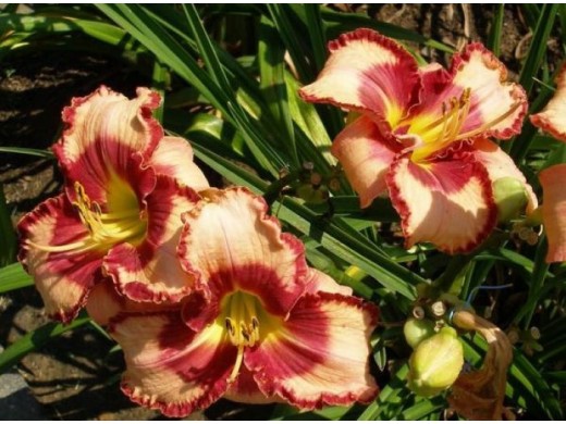 Цветки розовый с красным глазком и такой же каймой с золотистым краем, гофрированный. Высота 65см, диаметр цветка 14см. Срок цветения апрель-сентябрь.