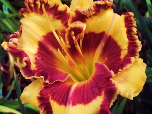 Высота взрослого растения 55 см. Цветок диаметром 14см, кремовый с пурпурным центром переходящий в тонкий кант на верхних лепестках. Повторно цветущий.
