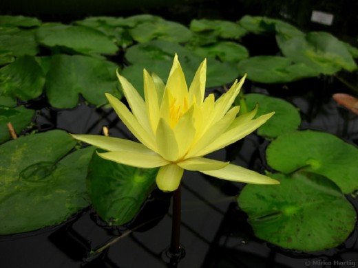 Сорт демонстрирует 15-20 см чашевидные звездообразные, желтые цветы и средние светло-зеленых листьев с темным мраморным эффектом, который исчезает с возрастом. Цветок стоит на 20 см над водой на мелководье и имеет аромат лимона. Mexicana – это сорт с низким уровнем цветения, распространяющееся на 20 см в воде.Характеристики: