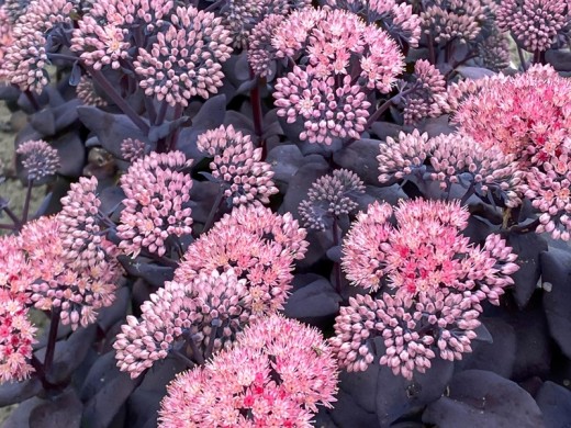 Высота 40см и ширина 50см. Крупные листья цвета баклажана с серебристым напылением на бордовых побегах меняют оттенки в зависимости от освещения от голубовато-серо-дымчатых до сине-фиолетовых оттенков. Чем больше солнца попадает на листья, тем они темнее. В августе цветет розовыми звездчатыми цветочками в плоских соцветиях-корзиночках.
