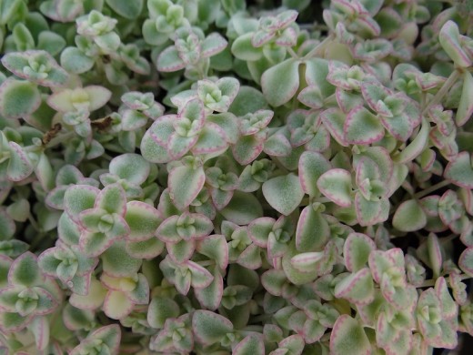 Очень компактный, обычно достигает высоты 5-10 см и разрастается в ширину до 20-30 см. Листья мелкие, мясистые, округлые или яйцевидные, расположены супротивно на стеблях. Окраска листьев очень декоративна. Края листьев кремово-белые или розовые. Центральная часть листа зеленая. В прохладную погоду или при воздействии солнечных лучей розовый оттенок может становиться более интенсивным. Ползучие, стелющиеся, хорошо укореняются в местах соприкосновения с почвой, формируя плотный коврик.
