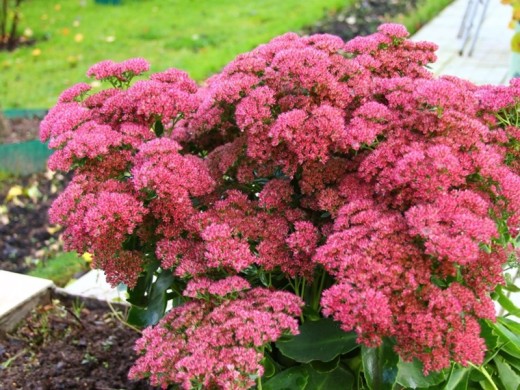 Высота растения доходит до 60см, ширина 40-60см , образуя небольшой кустик. Цветки красного цвета, собранные в крупные соцветия достигающие 10см. Цветёт очиток с начало августа и до октября. Листики зелёные, гладкие, зубчатые.