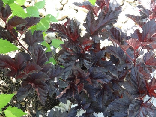 Куст достигает до 1,8м в высоту и 2м в ширину. Листья очередные, блестящие, темно-пурпурные. Прирост до 30 см в год.