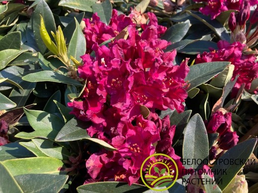 Рододендрон гибридный "Kali" вечнозеленый кустарник, один из красивейших сортов с крупными цветами темно-красных оттенков. Он привлекательно выглядит в групповой посадке или отдельно стоящим кустом, прекрасный компаньон для хвойных растений.