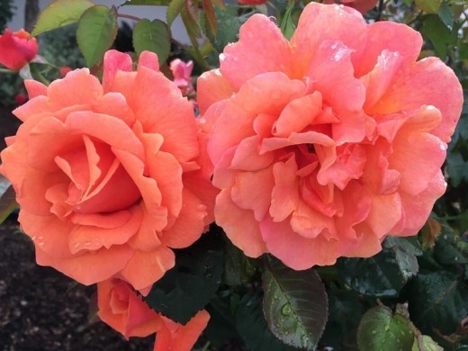 Цветки окрашены в лососево-розовый цвет с оранжевыми оттенками.