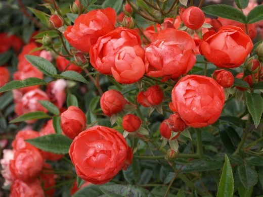 Темно-оранжевые круглые бутоны раскрываются в розу диаметром 4-5 см; полукарликовая роза с плотным скоплением 9-16 лепестков.