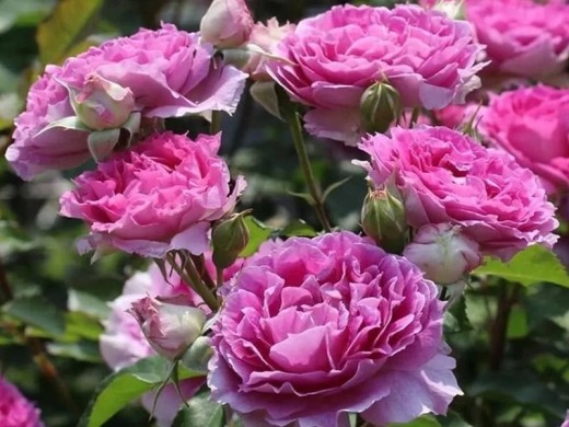Цветки окрашены в насыщенный розовый цвет с сиреневым оттенком.