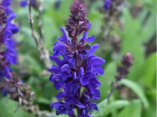 Высота растения 45-50 см, ширина 50-55 см. Сорт примечателен своим цветением фиолетовыми соцветиями в течение всего лета. Они гордо стоят на жестких темно-фиолетово-коричневых, почти черных стеблях, за что и получили свое название. Это очень темно-фиолетовое цветение непрерывное, с мая по сентябрь. Сорт привлекательный для насекомых-опылителей, при растирании он источает сладкий аромат. Хорошо приживается, быстро образует густую и компактную куртину, хорошо разветвляется. Цветет в июне-августе. Листва морщинистая, побеги у него темно-зеленые. В них содержатся эфирные масла. Поэтому они имеют яркий и насыщенный аромат.
