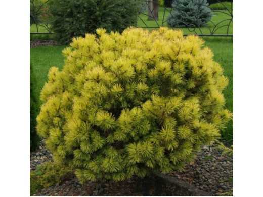 Кустарниковая форма сосны. Крона подушкообразная, густая и плотная. Ветви от короткого ствола растут вверх. Они покрыты жесткими прямыми 3-сантиметровыми иголками. Оттенок хвои меняется в течение года: летом иголочки яркого изумрудного цвета, осенью они приобретают лимонный оттенок, зимой бронзово-желтые. Годовой прирост в высоту и ширину до 6 см. Карликовое растение светолюбиво, не выносит затенения. Предпочитает легкие плодородные почвы с наличием песка и гравия в составе. Плохо переносит сухость и загазованность воздуха.Характеристики: