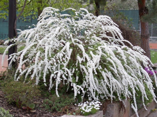 Зацветает в мае-июне, мелкими белыми цветками, собранными в соцветия и расположенными вдоль всего побега. Цветение настолько обильное, что за ним не видно мелкой листвы и побегов.