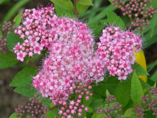 Цветет очень обильно в июне-июле, многочисленные розовые цветки собраны в щитковидные соцветия до 4 см в диаметре.